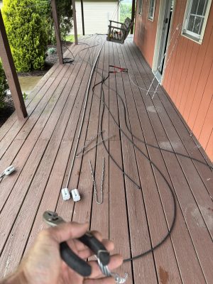 I know I have all the parts to build the station – I just have to find them and then modify things to fit the new situation. Today was guy wire day. I unrolled the Phillystran to know what I had and then started reworking the steel guy wires and insulators.