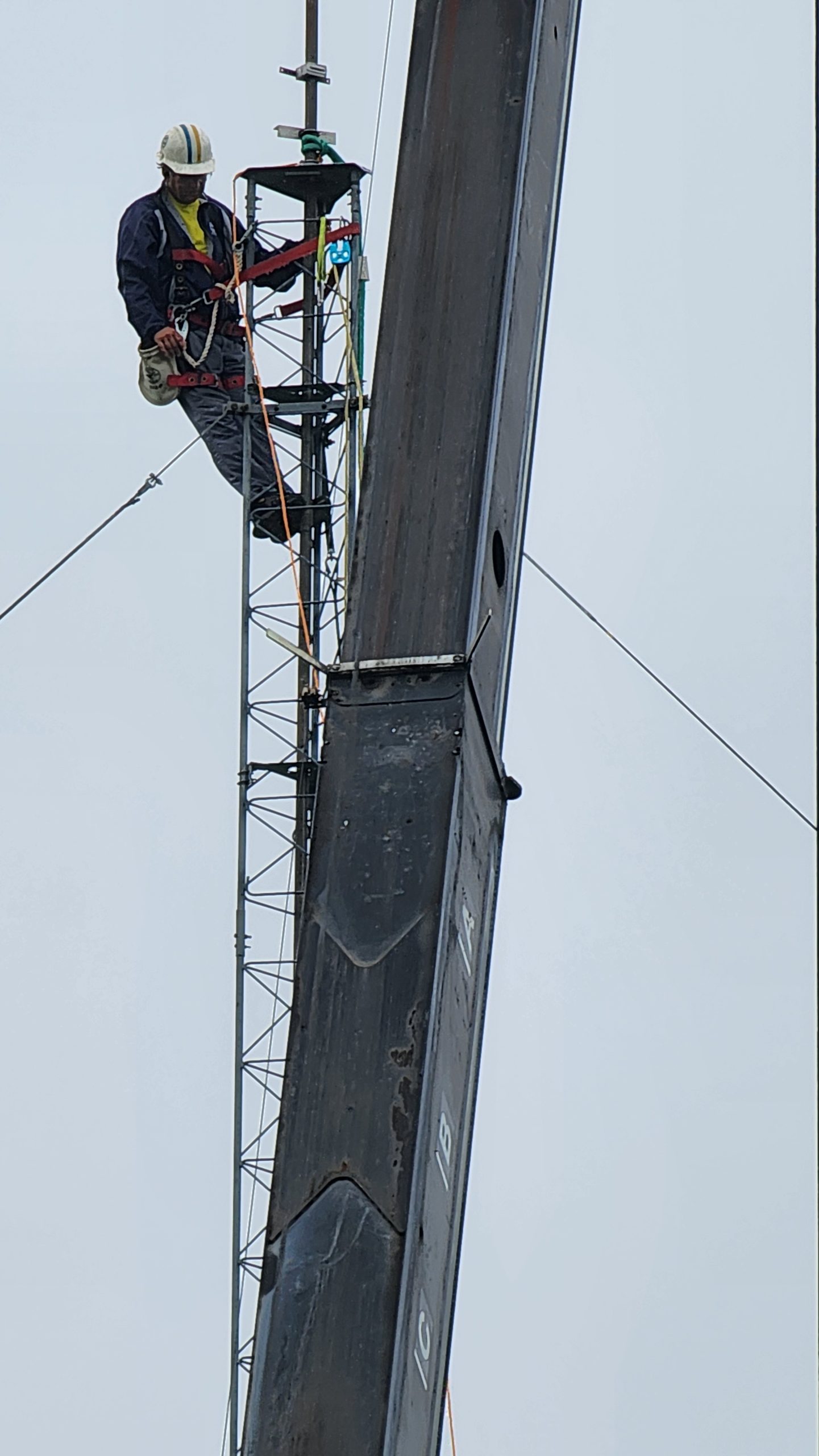 We decided to use cell phones to communicate between the crane operator and me. It worked out really well since I could use earbuds and keep my hands free. Once things were ready, I started climbing. When I got to the to,p I was surprised to turn around and find the mast already halfway up to me!