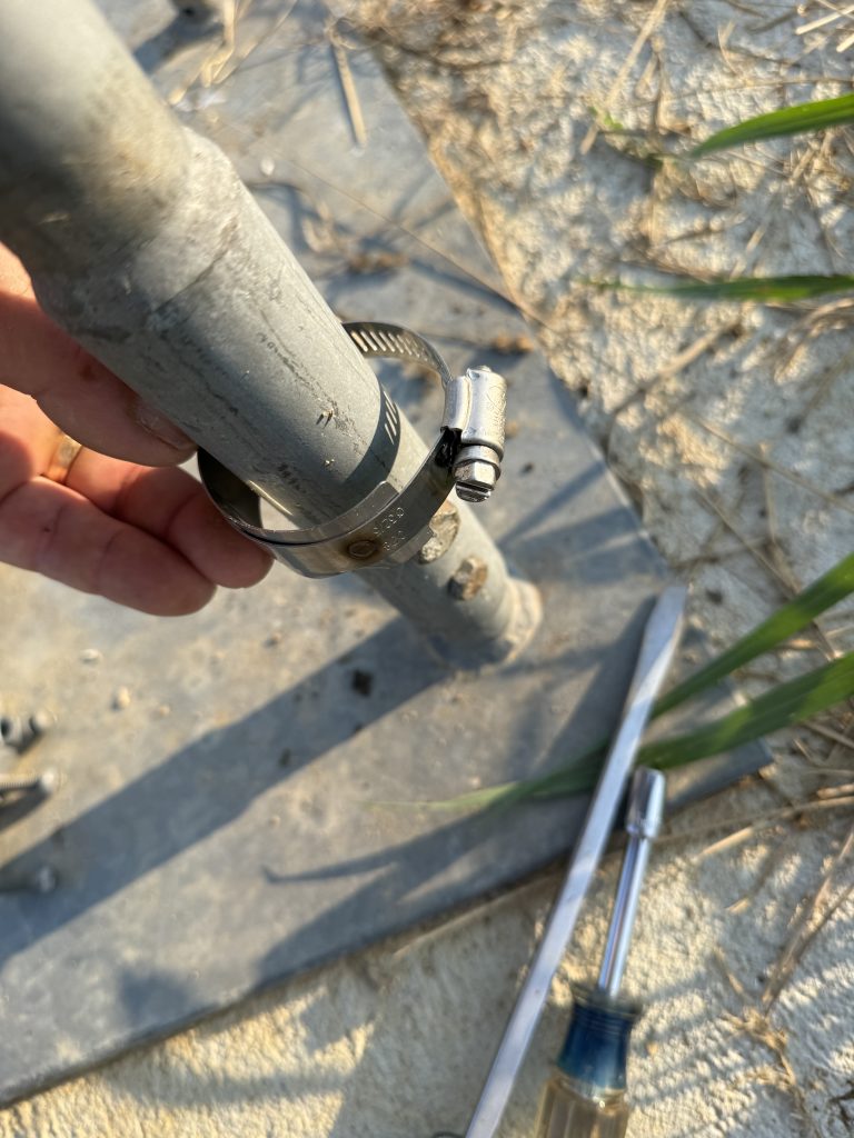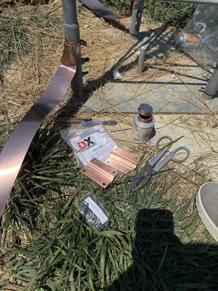 I used clamps from DX Engineering to connect the copper strap to the tower legs. The clamps are simply hose clamps with a piece of stainless steel welded to them. The intent is to reduce corrosion due to dissimilar metals at the connection. I used plenty of SS-30 between every connection.